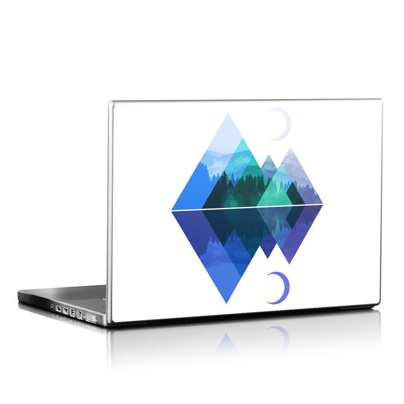 iStyles Universal Fit Laptop Skin design of Blue, Cobalt blue, Azure, Pattern, Logo, Design, Electric blue, Graphics, Illustration, Triangle, with white, blue, purple, green colors, and tagged with nature, objects, signs, earth, geometry, moon, mountains, nature, plants, trees.