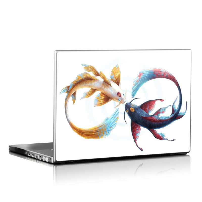 iStyles Universal Fit Laptop Skin design of Marine invertebrates, Art, Wing, Feather, Tree, Beak, Electric blue, Fish, Natural material, Painting, with white, black, yellow, orange, red, blue colors, and tagged with animals, signs, blue, fish, koi, red, yellow.