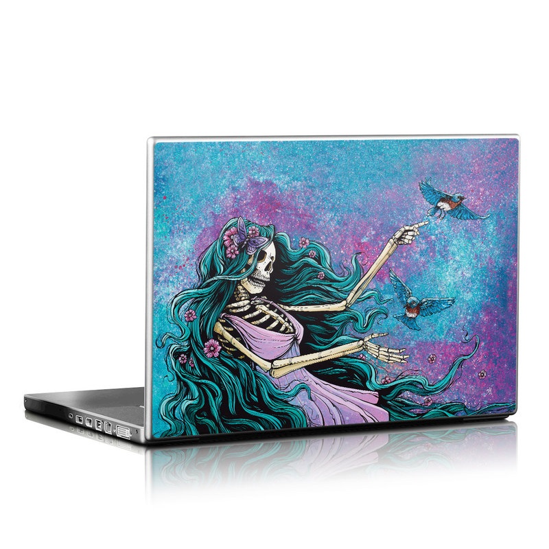 iStyles Universal Fit Laptop Skin design of Green, Purple, Painting, Paint, Art, Cg artwork, Mythical creature, Musical instrument, Graffiti, Artist, with blue, purple, white, gray, brown colors, and tagged with skulls, flowers, animals, blue, hair, purple, dress, beautiful, woman, girl, bird.