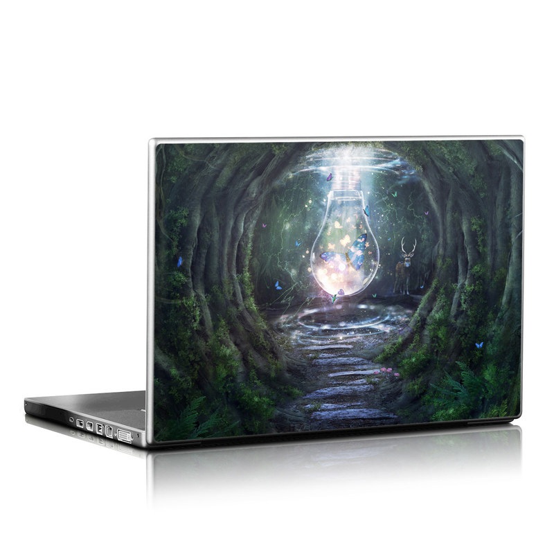iStyles Universal Fit Laptop Skin design of Nature, Green, Darkness, Natural environment, Light, Infrastructure, Tunnel, Tree, Forest, Art, with white, black, brown, green, blue, yellow colors, and tagged with fantasy, animals, nature, animals, butterfly, deer, fantasy, forest, sci-fi, woods.