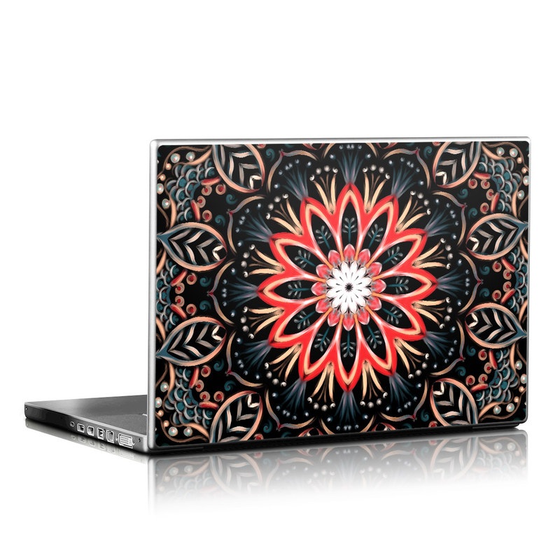 iStyles Universal Fit Laptop Skin design of Pattern, Psychedelic art, Symmetry, Design, Art, Visual arts, Textile, Kaleidoscope, Fractal art, Ornament, with black, red, white, blue, yellow, orange colors, and tagged with patterns, flowers, abstract, abstract, blue, bright, floral, flower, orange, white.