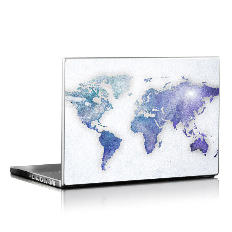 iStyles Universal Fit Laptop Skin design of World, Map, Watercolor paint, Illustration, with white, blue, purple colors, and tagged with maps, globe, map, pastel, travel, watercolor, world.