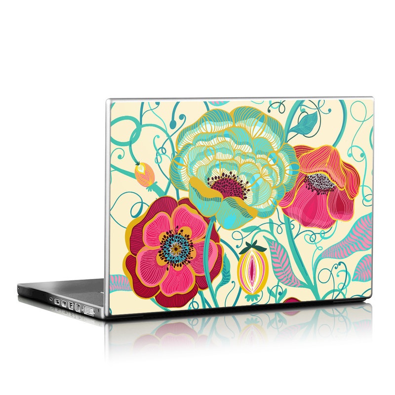 iStyles Universal Fit Laptop Skin design of Plant, Botany, Textile, Pink, Creative arts, Petal, Magenta, Art, Pattern, Rectangle, with white, red, pink, yellow, green, blue, black colors, and tagged with patterns, flowers, flowers, garden, vine.