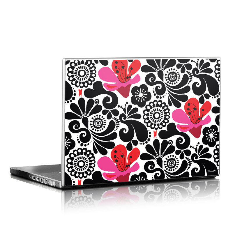 iStyles Universal Fit Laptop Skin design of White, Product, Green, Botany, Petal, Textile, Pink, Creative arts, Line, Magenta, with black, white, pink, red colors, and tagged with patterns, flowers, black, blackandwhite, floral, flower, flowers, paisley, white.