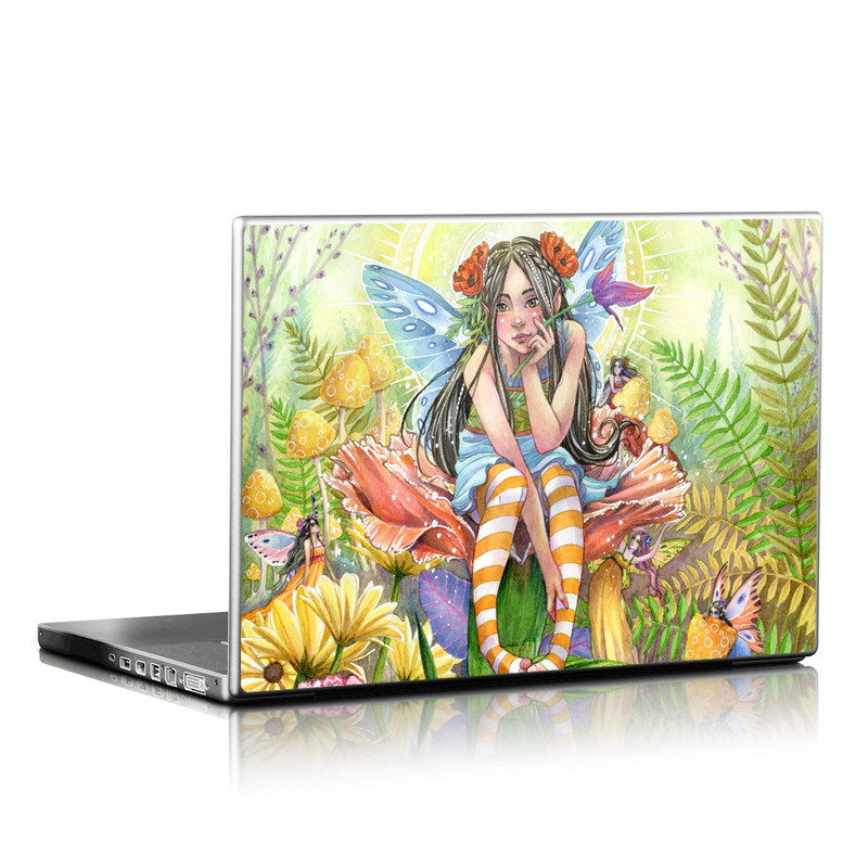 iStyles Universal Fit Laptop Skin design of Fictional character, Illustration, Art, Plant, Painting, Wildflower, Mythical creature, with gray, green, black, yellow, red colors, and tagged with fantasy, people, animals, flowers, nature, fairy, floral, nature, people.