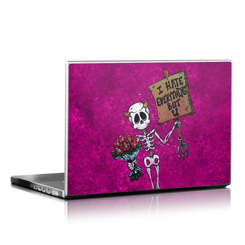 iStyles Universal Fit Laptop Skin design of Purple, Pink, Violet, Magenta, Font, Tints and shades, Art, Electric blue, Skull, Rectangle, with white, gray, pink, red, green, brown, black colors, and tagged with skulls, flowers, objects, signs, flowers, love, message.