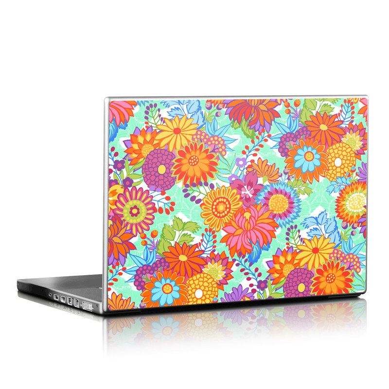 iStyles Universal Fit Laptop Skin design of Pattern, Floral design, Orange, Flower, Design, Textile, Plant, Wildflower, Wrapping paper, Visual arts, with gray, orange, green, purple colors, and tagged with patterns, flowers, bright, carnival, floral, flowers, fuchsia, green, orange, pattern, pink, yellow.