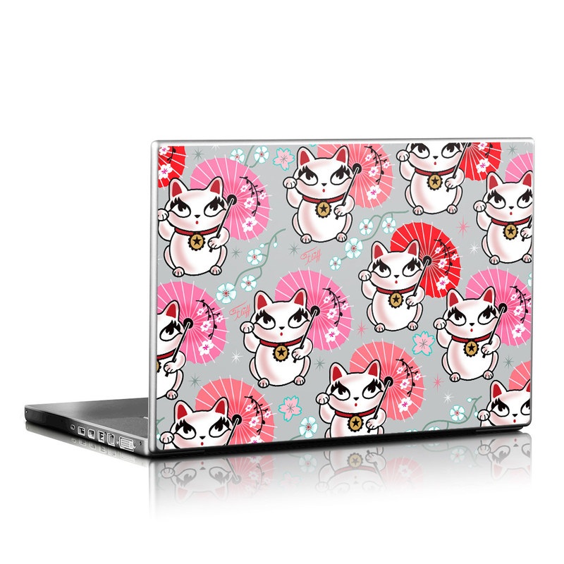 iStyles Universal Fit Laptop Skin design of Pink, Red, Cartoon, Design, Line, Textile, Pattern, Illustration, Smile, Fictional character, with white, red, pink, gray, blue, black colors, and tagged with patterns, animals, objects, cat, cats, fantasy, flower, flowers, grey, pink.