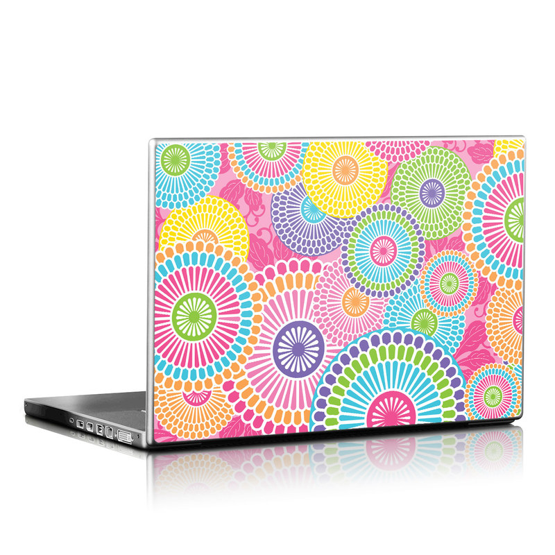 iStyles Universal Fit Laptop Skin design of Pattern, Circle, Textile, Design, Visual arts, Wrapping paper, with gray, pink, purple, orange, blue, green colors, and tagged with patterns, flowers.