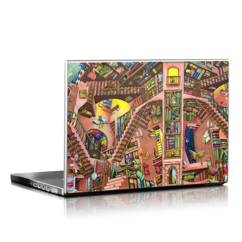 iStyles Universal Fit Laptop Skin design of Cartoon, Building, Art, Architecture, Design, Fun, Retail, Illustration, Neighbourhood, Room, with pink, yellow, blue, red, orange, brown colors, and tagged with patterns, urban, objects, animals, book, books, fantasy, illustration, library, reading.