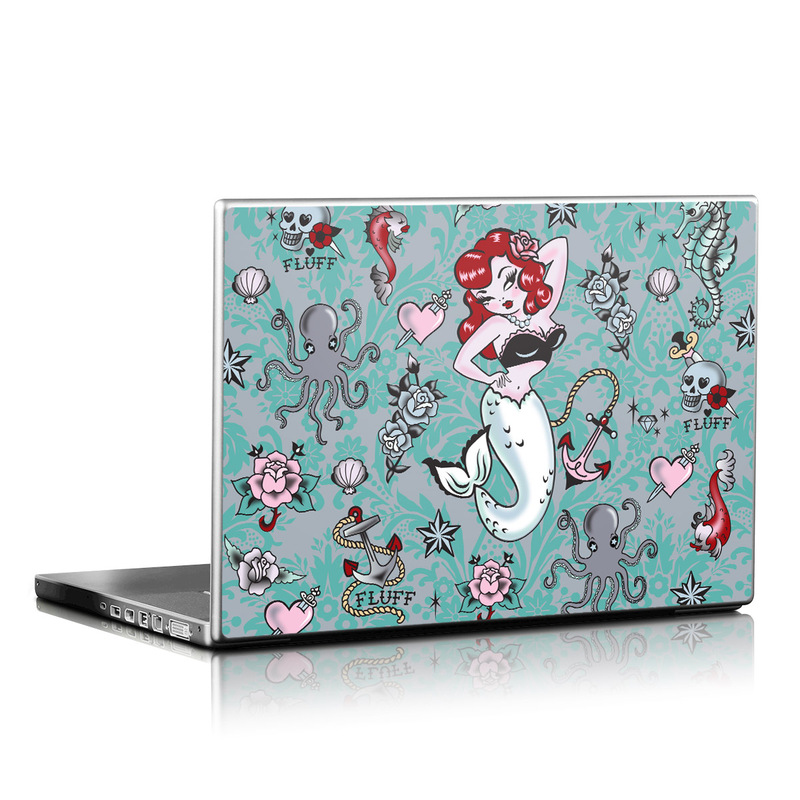 iStyles Universal Fit Laptop Skin design of Mermaid, Illustration, Fictional character, Organism, Art, Pattern, Style, with gray, blue, black, red, white, pink colors, and tagged with patterns, objects, hearts, people, animals.