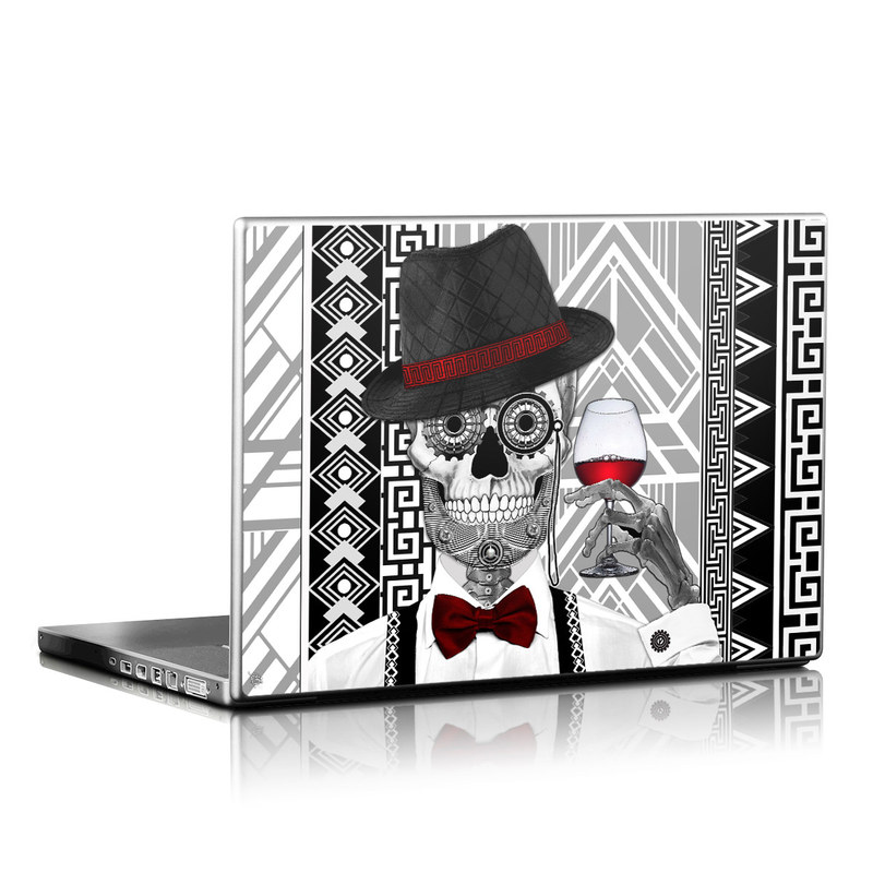 iStyles Universal Fit Laptop Skin design of Cartoon, Poster, Font, Illustration, Headgear, Games, Photo caption, Fictional character, Graphic design, Hat, with black, white, red colors, and tagged with skulls, objects, patterns, 1920's, artdeco, blackandwhite, calavera, dayofthedead, diadelosmuertos, flapper, greatgatsby, newmexico, pattern, skeleton, skull, sugarskull, vanderbone, wine.