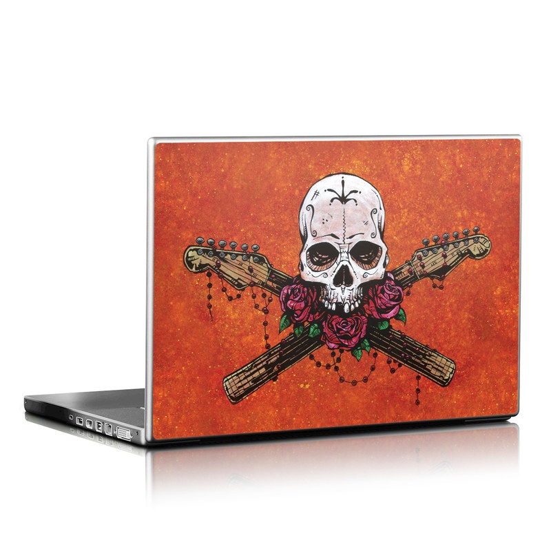 iStyles Universal Fit Laptop Skin design of Sleeve, Orange, Skull, Font, Bone, Art, T-shirt, Symbol, Circle, Emblem, with black, white, gray, brown, red, green colors, and tagged with skulls, flowers, objects, music, guitar, roses, rock, roll.