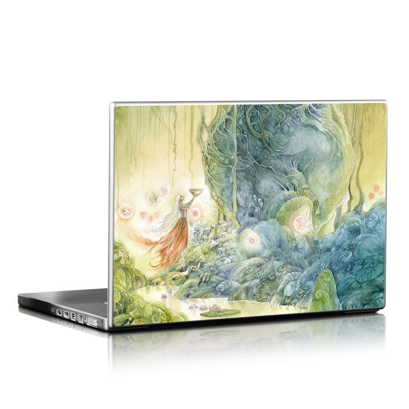 iStyles Universal Fit Laptop Skin design of Green, Watercolor paint, Painting, Water, Art, Illustration, Grass, Tree, Plant, Fictional character, with blue, green, red, yellow colors, and tagged with people, nature, fantasy, flowers, fairies, fantasy, landscape, sci-fi, tree.