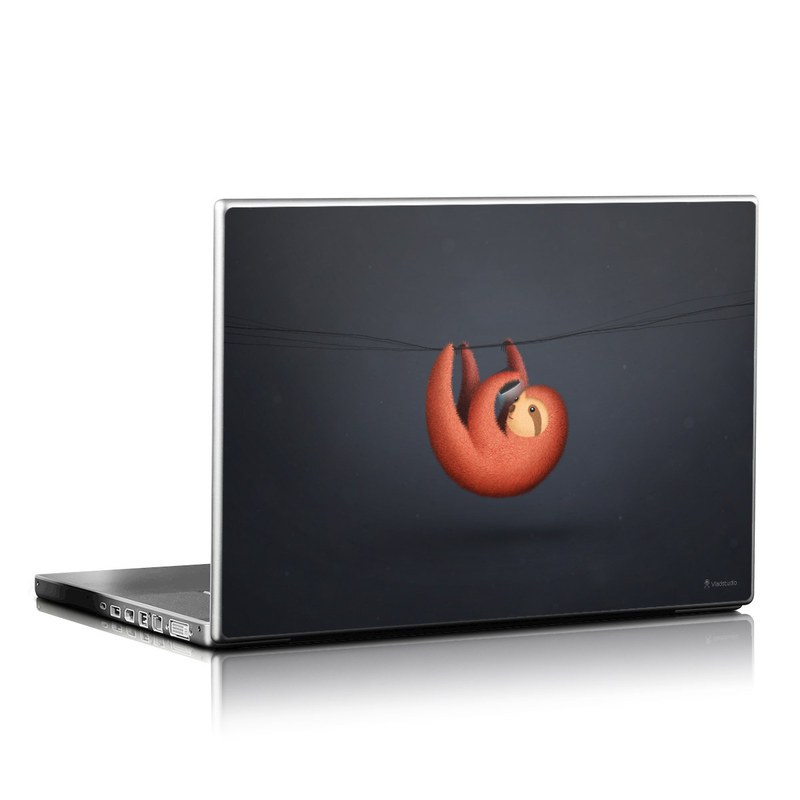 iStyles Universal Fit Laptop Skin design of Orange, Still life photography, Logo, Graphics, with black, orange, brown, gray colors, and tagged with animals, objects, animals, funny, humor, sloth, technology.