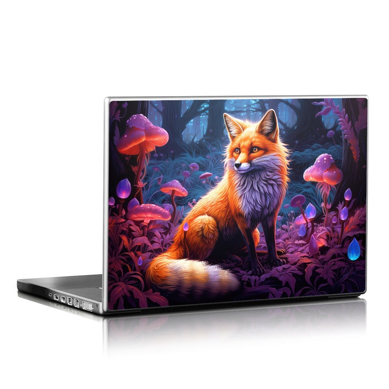 iStyles Universal Fit Laptop Skin design of Plant, Light, Carnivore, Orange, Organism, Tree, Pink, Natural landscape, Fawn, Whiskers, with red, orange, white, black, purple, gray, green colors, and tagged with animals, nature, fineart, fox, forest, mushrooms, trees, dusk, glow, bushy, tail.