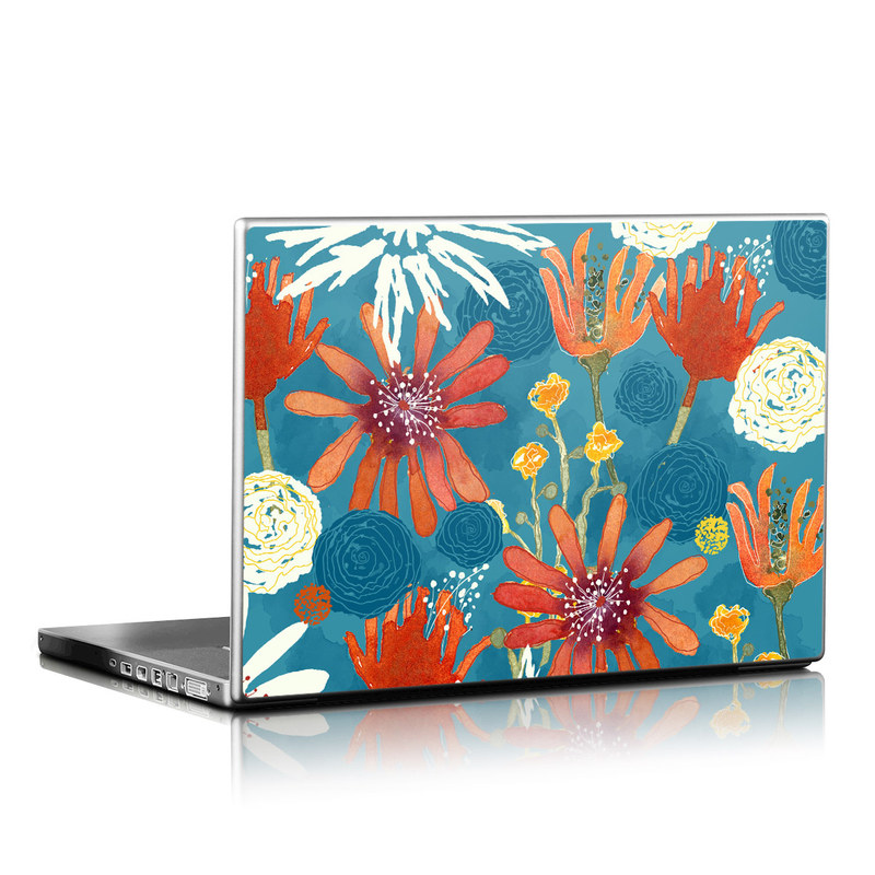 iStyles Universal Fit Laptop Skin design of Pattern, Visual arts, Wrapping paper, Design, Wildflower, Floral design, Textile, Flower, Plant, Motif, with blue, red, gray, yellow, green colors, and tagged with flowers, patterns.