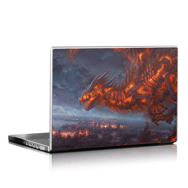 iStyles Universal Fit Laptop Skin design of Geological phenomenon, Dragon, Cg artwork, Sky, Flame, Fictional character, Mythology, Lava, Demon, Heat, with red, blue, black colors, and tagged with fantasy, animals, nature, dragon, fire, flame, monster, skeleton.