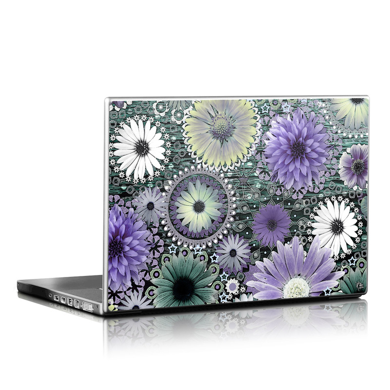 iStyles Universal Fit Laptop Skin design of Purple, Flower, african daisy, Pericallis, Plant, Violet, Lavender, Botany, Petal, Pattern, with gray, black, blue, purple, white colors, and tagged with flowers.