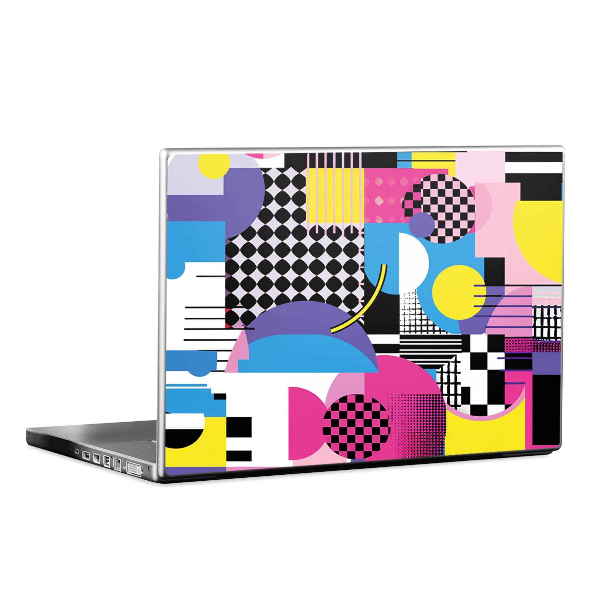 iStyles Universal Fit Laptop Skin design of Rectangle, Textile, Art, Font, Line, Material property, Magenta, Pattern, Circle, Tints and shades, with pink, yellow, white, black, purple, blue colors, and tagged with abstract, abstract, circles, checkered, squares.