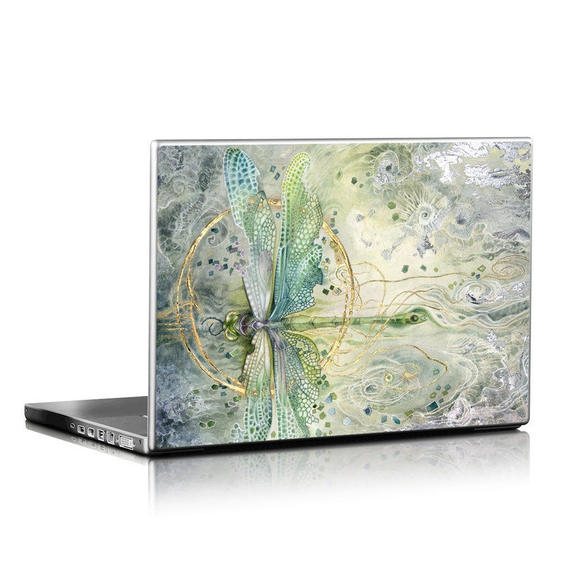 iStyles Universal Fit Laptop Skin design of Green, Painting, Watercolor paint, Water, Acrylic paint, Leaf, Visual arts, Plant, Art, Photography, with green, yellow, blue, gray colors, and tagged with animals, bugs, dragonfly, insects.