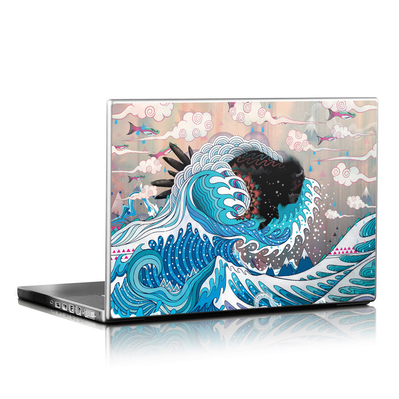 iStyles Universal Fit Laptop Skin design of Blue, Turquoise, Illustration, Aqua, Graphic design, Pattern, Art, Design, Graphics, Visual arts, with gray, blue, black, pink, white colors, and tagged with abstract, animals, nature, bison, blue, buffalo, bull, greatwave, ocean, teal, wave.