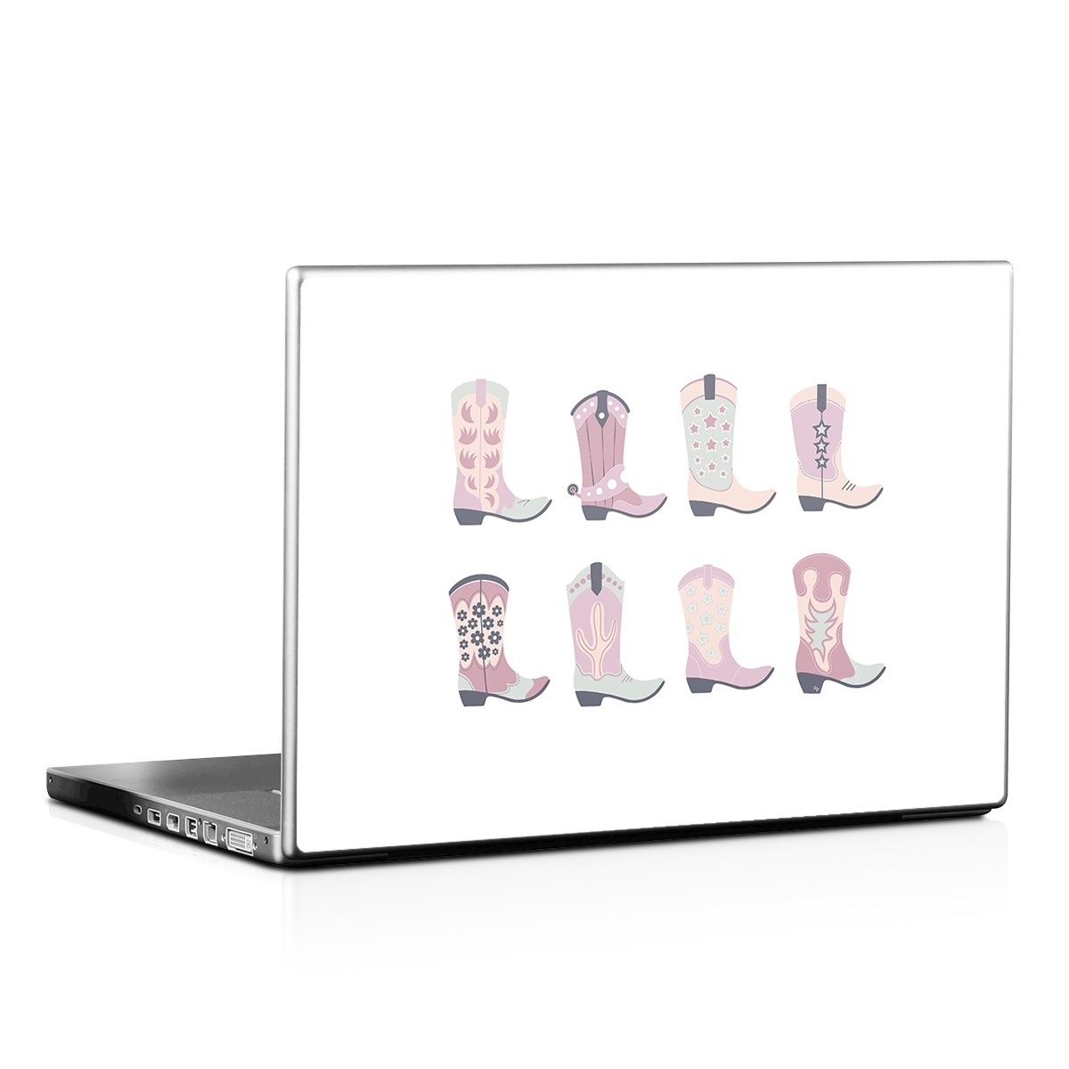 iStyles Universal Fit Laptop Skin design of Footwear, Shoe, White, Durango boot, Product, Fashion, Textile, Pink, Font, Red, with pink, white, blue, brown colors, and tagged with patterns, objects, fashion, flowers, girl, shoes, boots, cowgirl.