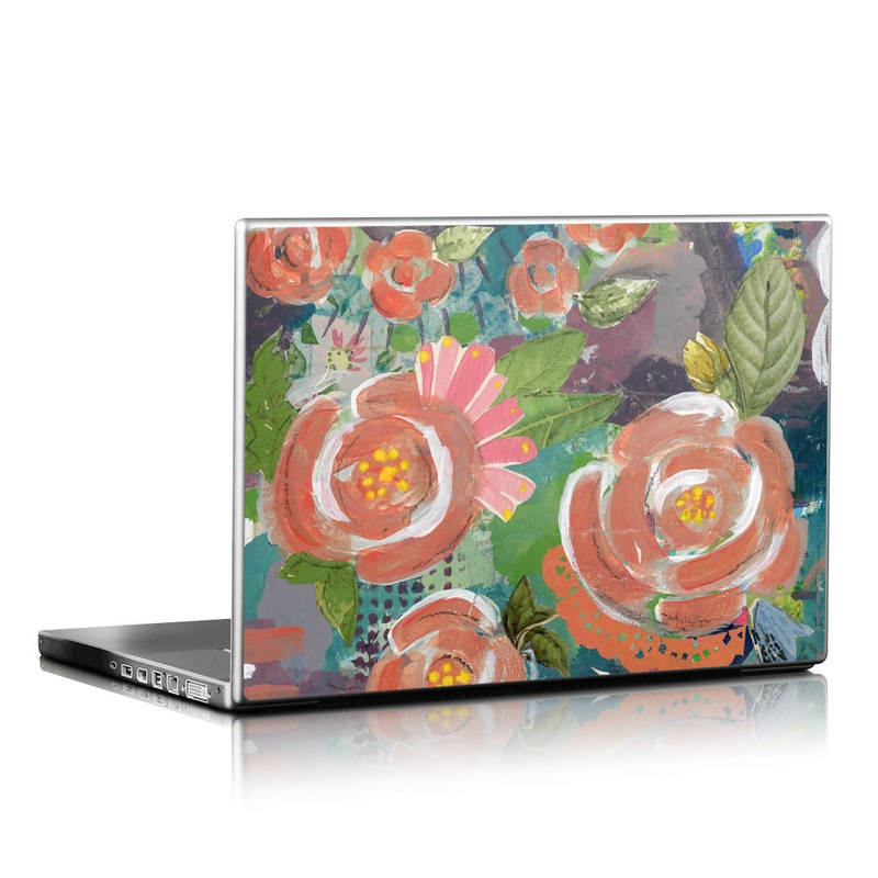 iStyles Universal Fit Laptop Skin design of Painting, Watercolor paint, Still life, Child art, Art, Illustration, Acrylic paint, Flower, Visual arts, Textile, with green, pink, red, yellow, blue, white, black, gray colors, and tagged with flowers, abstract, bright, flowers, nature, paint.