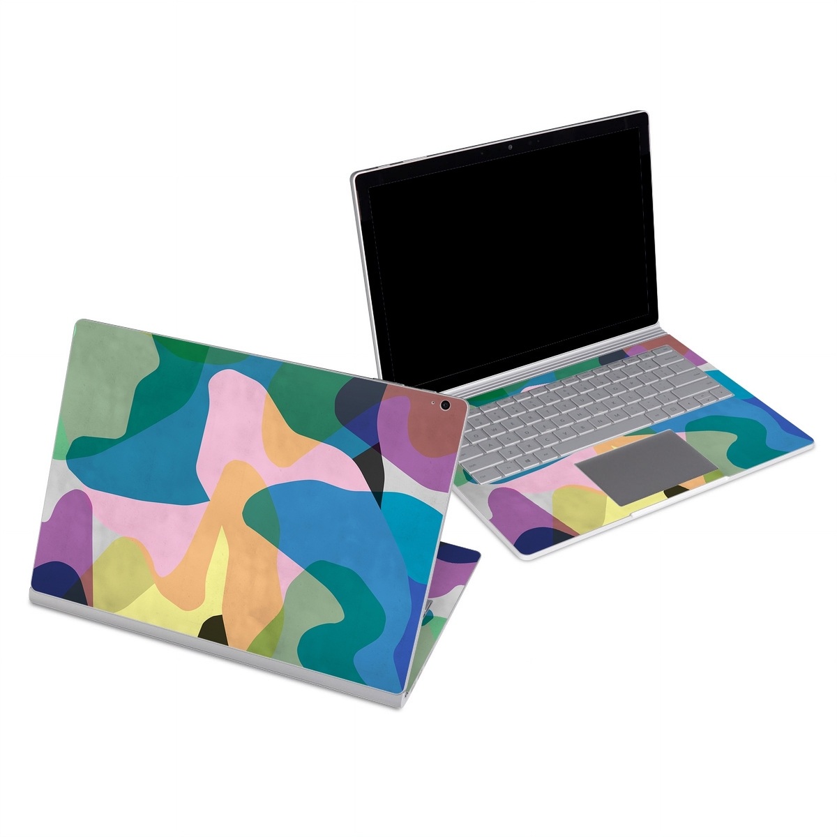 iStyles Microsoft Surface Book Series Skin design of Azure, Paint, Textile, Organism, Art, Painting, Aqua, Font, Rectangle, Tints and shades, with blue, green, pink, yellow, orange, purple, gray colors, and tagged with patterns, abstract, abstract, camo, camouflage, color, modern, paint, painting, pattern.