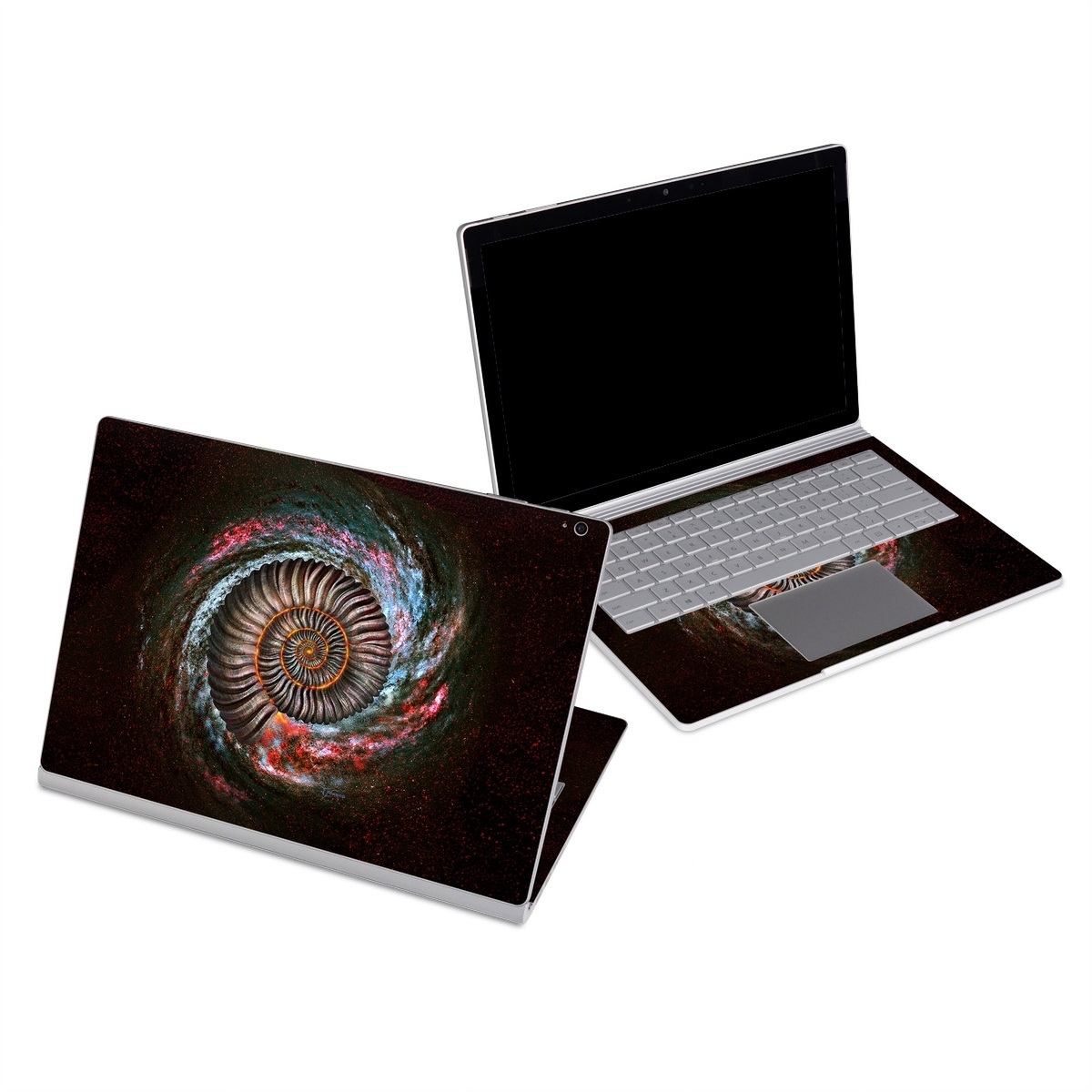 iStyles Microsoft Surface Book Series Skin design of Spiral, Fractal art, Vortex, Circle, Art, Ammonoidea, with black, brown, red, white, blue, green colors, and tagged with animals, patterns, space, celestial, galactic, galaxy, outerspace, sci-fi.