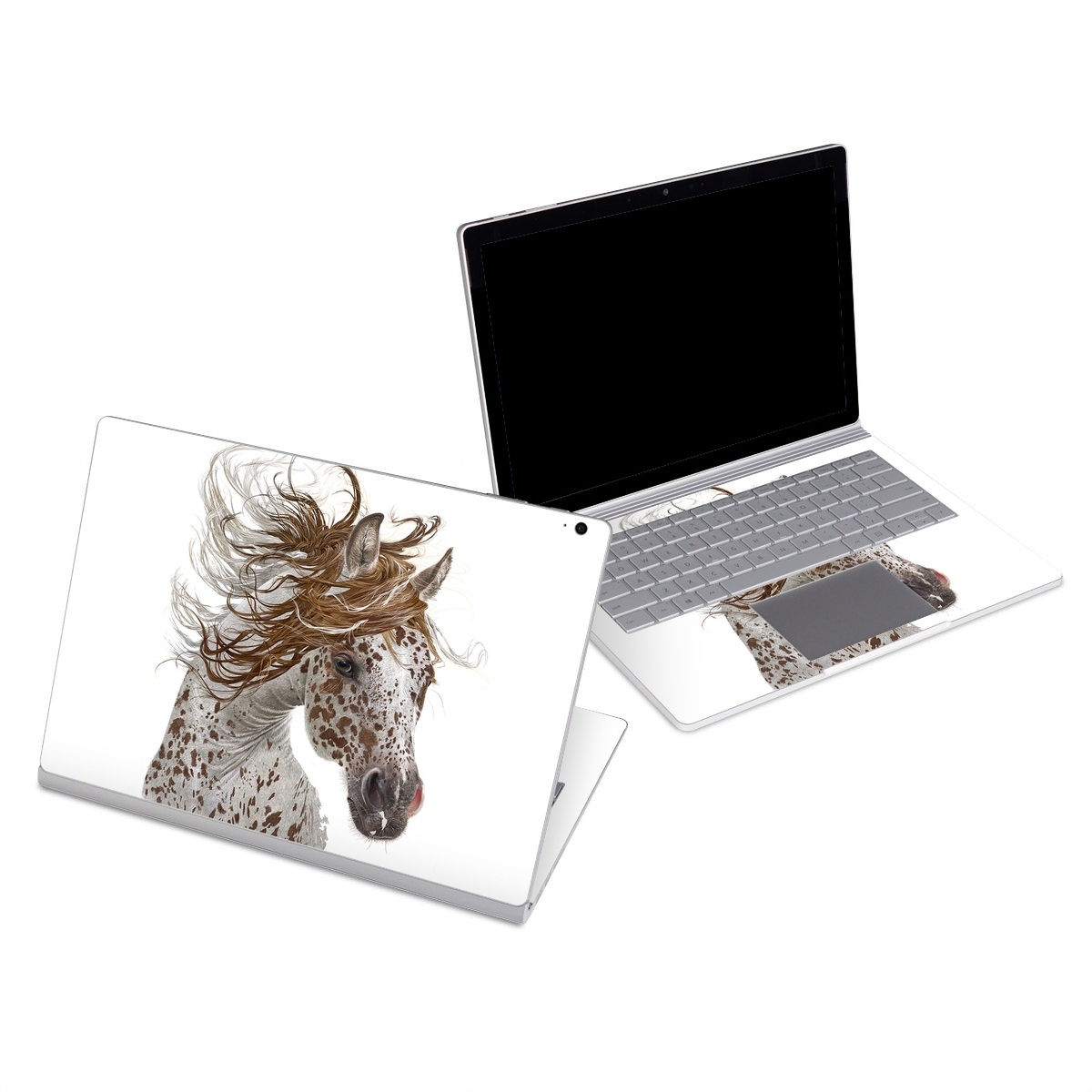 iStyles Microsoft Surface Book Series Skin design of Horse, Mane, Mustang horse, Illustration, Snout, Animal figure, Drawing, Stallion, Liver, Mare, with white, brown colors, and tagged with animals, animals, horse, horses, pony.