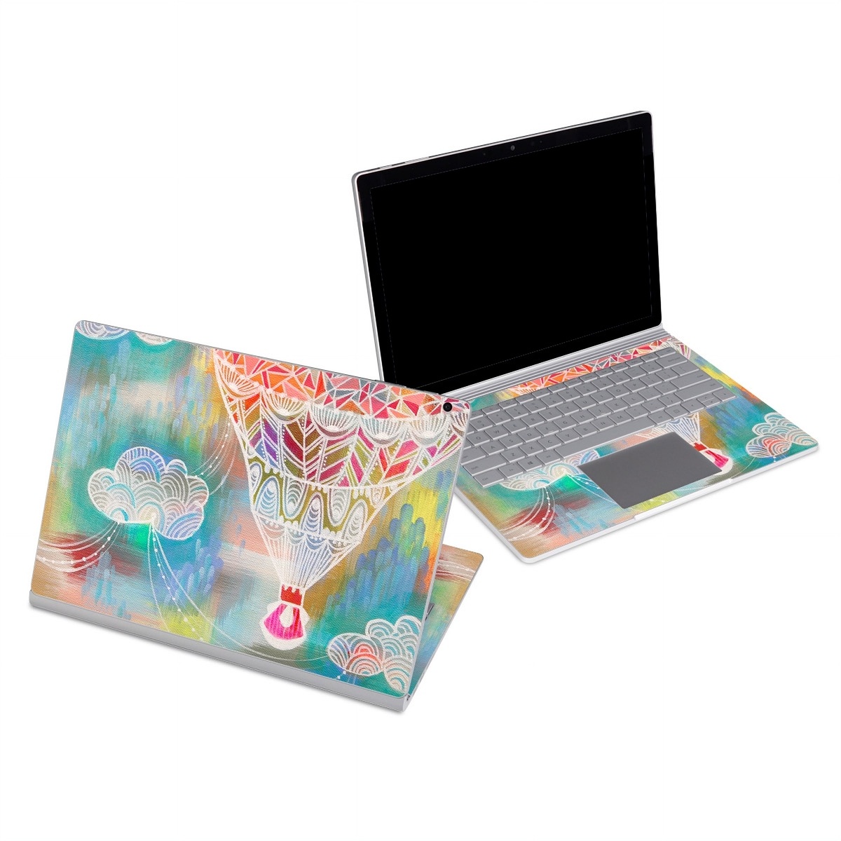 iStyles Microsoft Surface Book Series Skin design of Hot air balloon, Balloon, Illustration, Pattern, Vehicle, Aerostat, Hot air ballooning, Graphic design, Art, with blue, red, yellow, pink, white colors, and tagged with objects, nature.