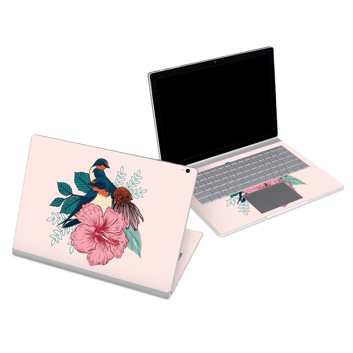 iStyles Microsoft Surface Book Series Skin design of Bird, Hawaiian hibiscus, Hibiscus, Illustration, Chinese hibiscus, Botany, Flower, Plant, Malvales, Mallow family, with blue, pink, green, yellow, red colors, and tagged with animals, flowers, nature.
