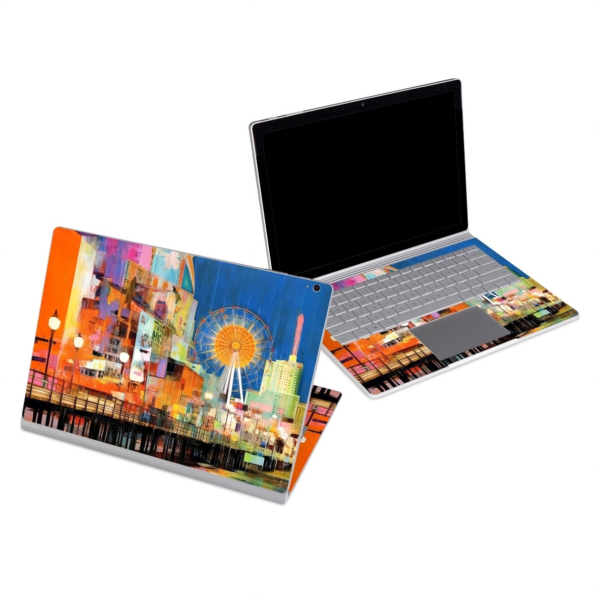 iStyles Microsoft Surface Book Series Skin design of Light, World, Window, Tints and shades, City, Art, Leisure, Event, Building, Ferris wheel, with black, white, blue, pink, red, orange, yellow, green colors, and tagged with fineart, urban, objects, seaside, ferry, wheel, buildings, stores, reflection.