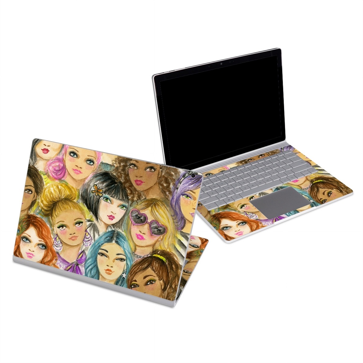 iStyles Microsoft Surface Book Series Skin design of Face, Hair, Head, Art, Hair coloring, Cheek, Illustration, Human, Watercolor paint, Brown hair, with white, black, brown, yellow, purple, blue, pink colors, and tagged with people, fineart, flowers, drawn, face, faces, fashion, handdrawn, painting, portrait, woman, women, sunglasses, chinese, caucasian, black, eurasian, asian, european, african.
