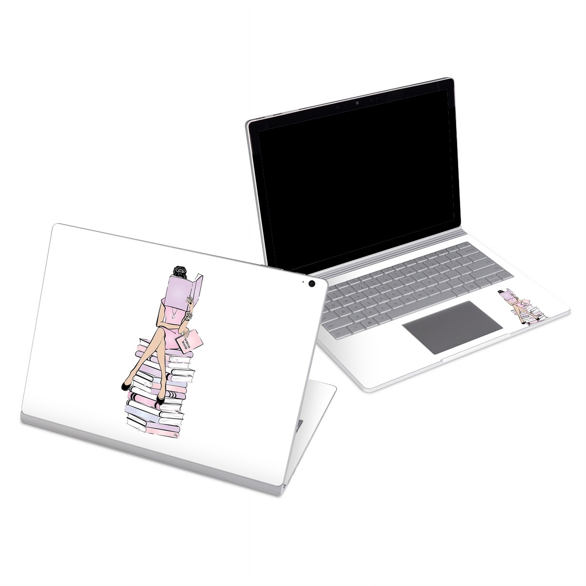 iStyles Microsoft Surface Book Series Skin design of Gesture, Art, Cartoon, Font, Drawing, Illustration, Painting, Fictional character, Animation, Diagram, with black, white, pink, purple, blue, yellow, brown colors, and tagged with signs, objects, people, books, girl, pink, purple, reading.