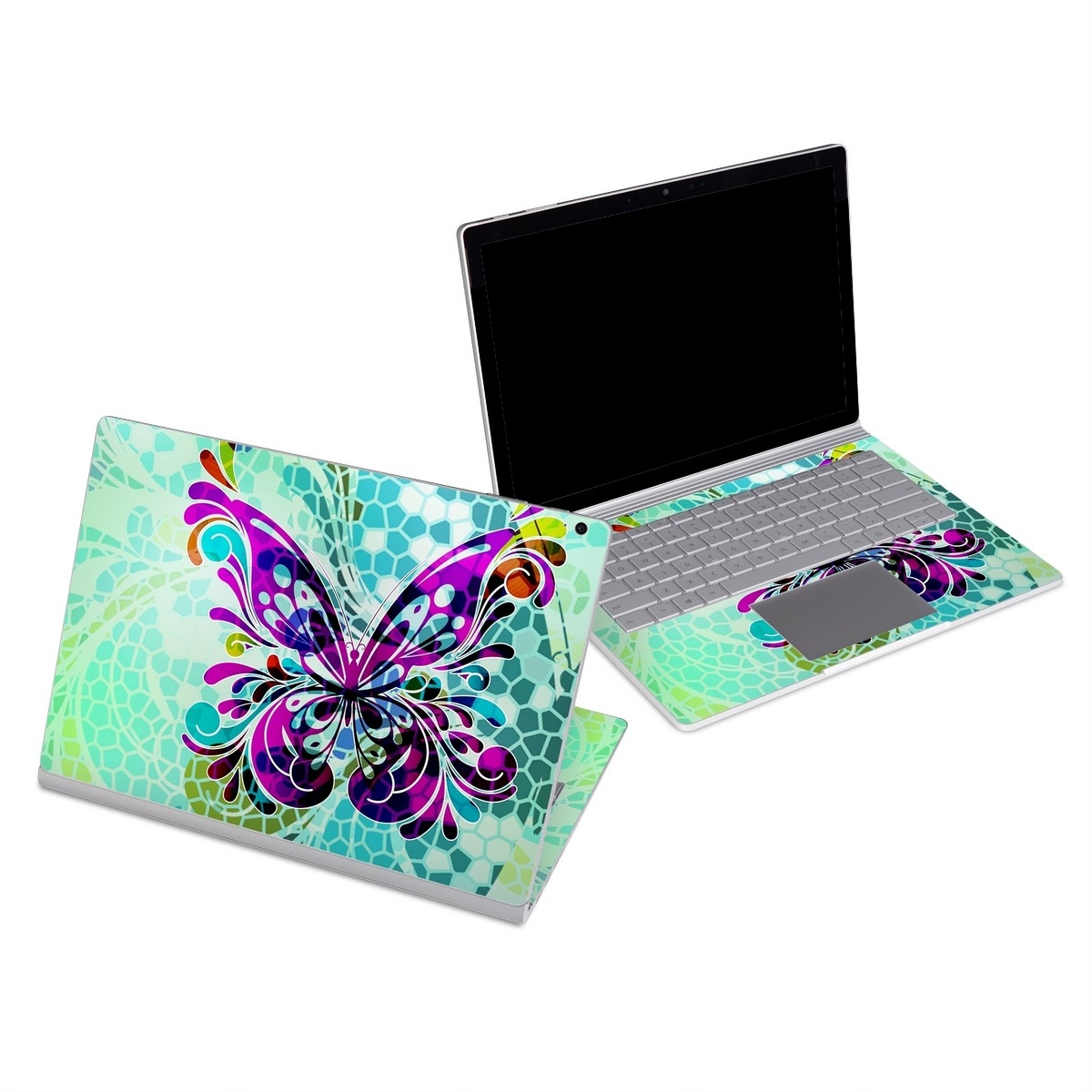 iStyles Microsoft Surface Book Series Skin design of Butterfly, Pattern, Insect, Moths and butterflies, Purple, Graphic design, Design, Pollinator, Visual arts, Magenta, with blue, green, purple colors, and tagged with patterns, animals.