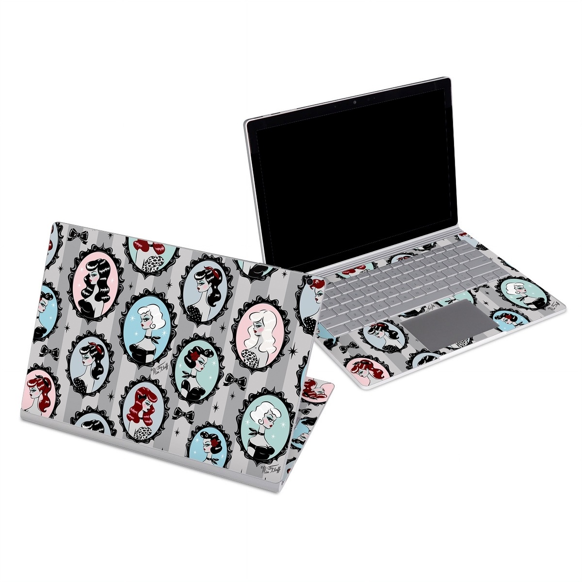 iStyles Microsoft Surface Book Series Skin design of Pattern, Design, Textile, Visual arts, Circle, Art, with black, blue, gray, yellow, red, pink colors, and tagged with patterns, people, objects, bows, cameo, dolls, pinup.