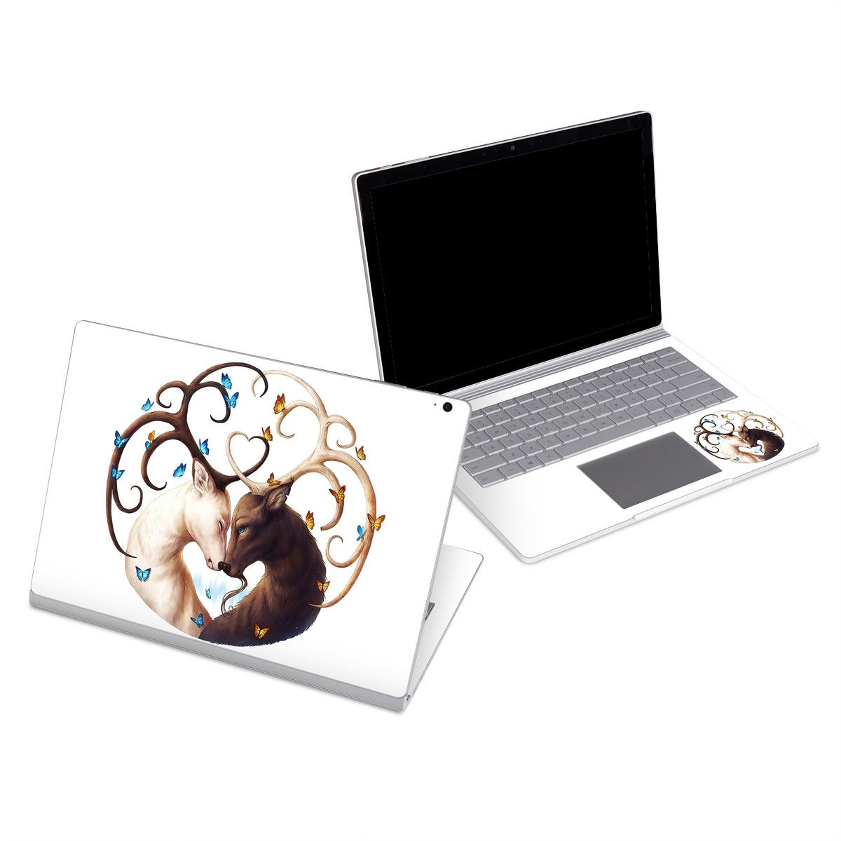 iStyles Microsoft Surface Book Series Skin design of Gesture, Fawn, Serveware, Horn, Font, Art, Mythical creature, Dishware, Tail, Drinkware, with white, brown, blue, yellow, orange colors, and tagged with animals, signs, antlers, butterflies, deer, yinyang.