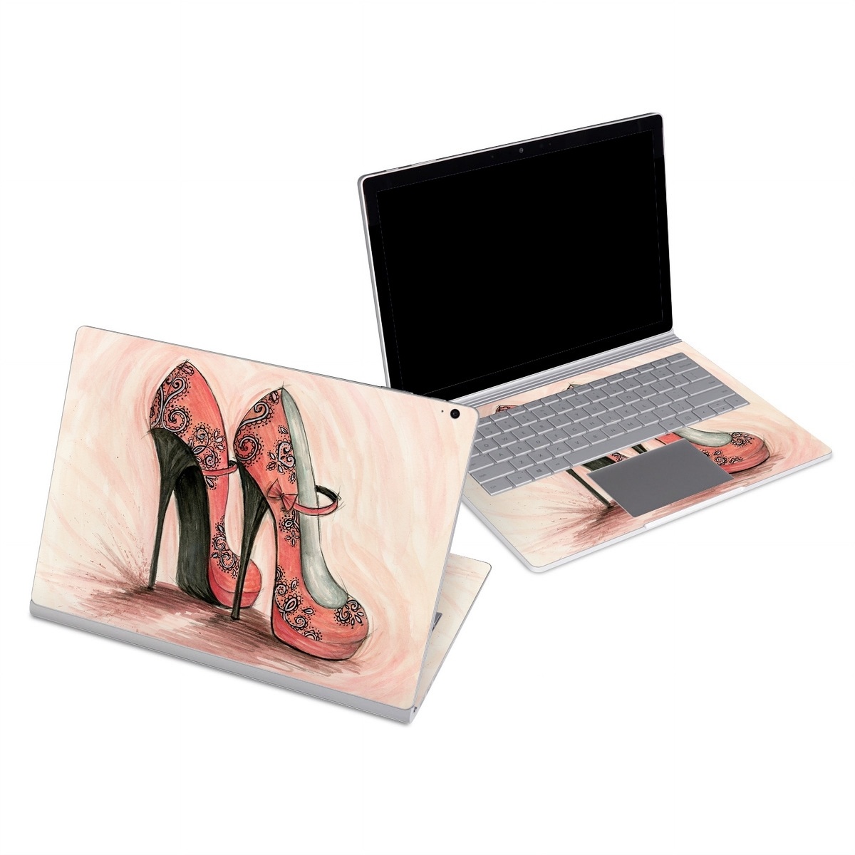 iStyles Microsoft Surface Book Series Skin design of Footwear, High heels, Shoe, Pink, Court shoe, Illustration, Leg, Basic pump, Peach, Painting, with pink, gray, red, white, black, green colors, and tagged with objects, fashion, fineart.