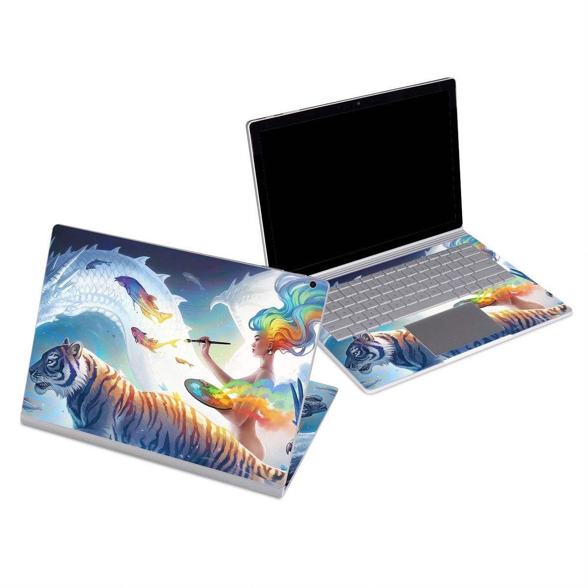 iStyles Microsoft Surface Book Series Skin design of Siberian tiger, Bengal tiger, Vertebrate, Tiger, Felidae, Mammal, Water, Carnivore, Art, Painting, with blue, red, yellow, orange, green, purple, black, white colors, and tagged with animals, people, objects, fantasy, artist, artistic, creative, fish, koi, paint, parrot, rainbow, woman.