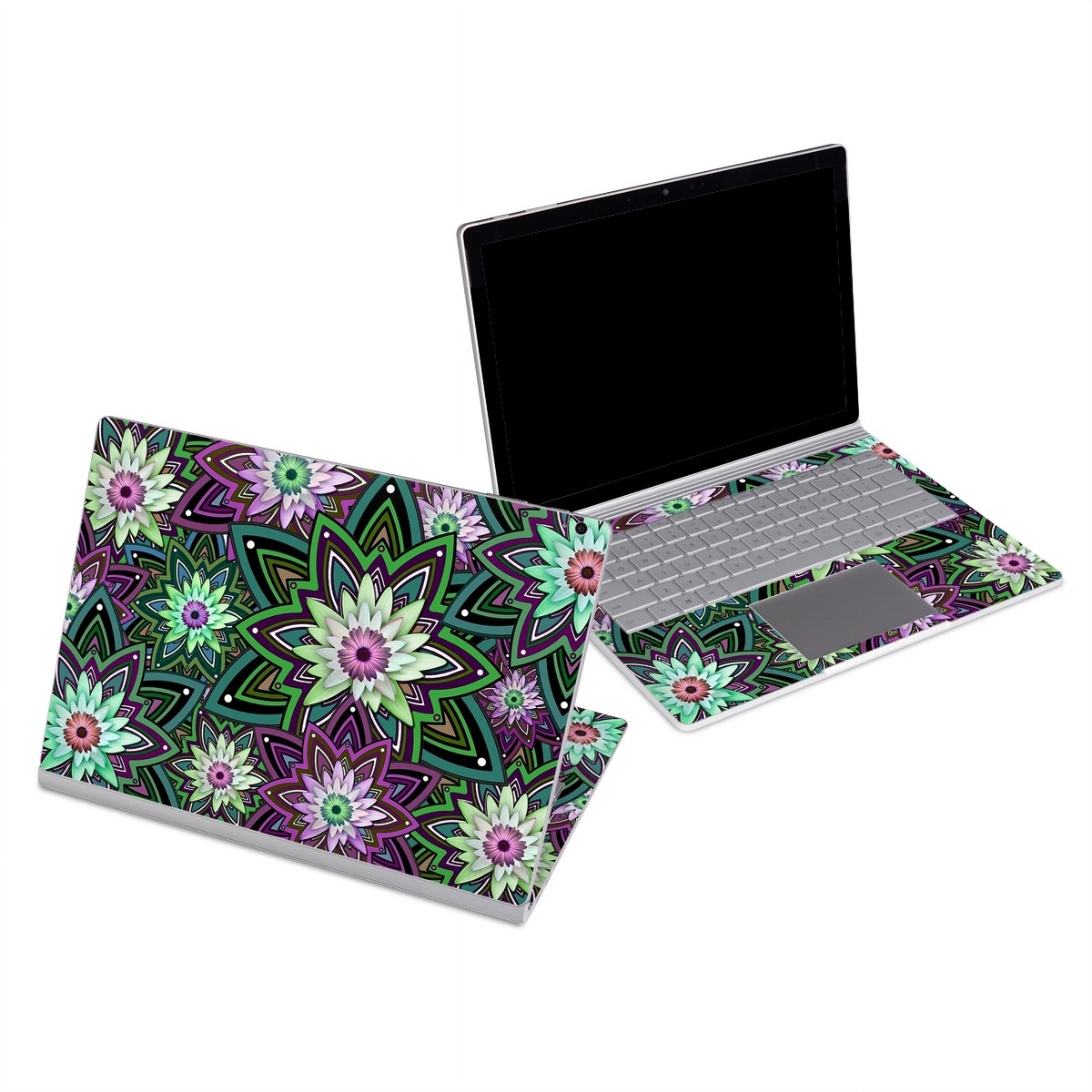iStyles Microsoft Surface Book Series Skin design of Pattern, Purple, Green, Flower, Psychedelic art, Design, Lilac, Plant, Symmetry, Visual arts, with black, gray, green, purple, blue, red colors, and tagged with patterns, flowers.