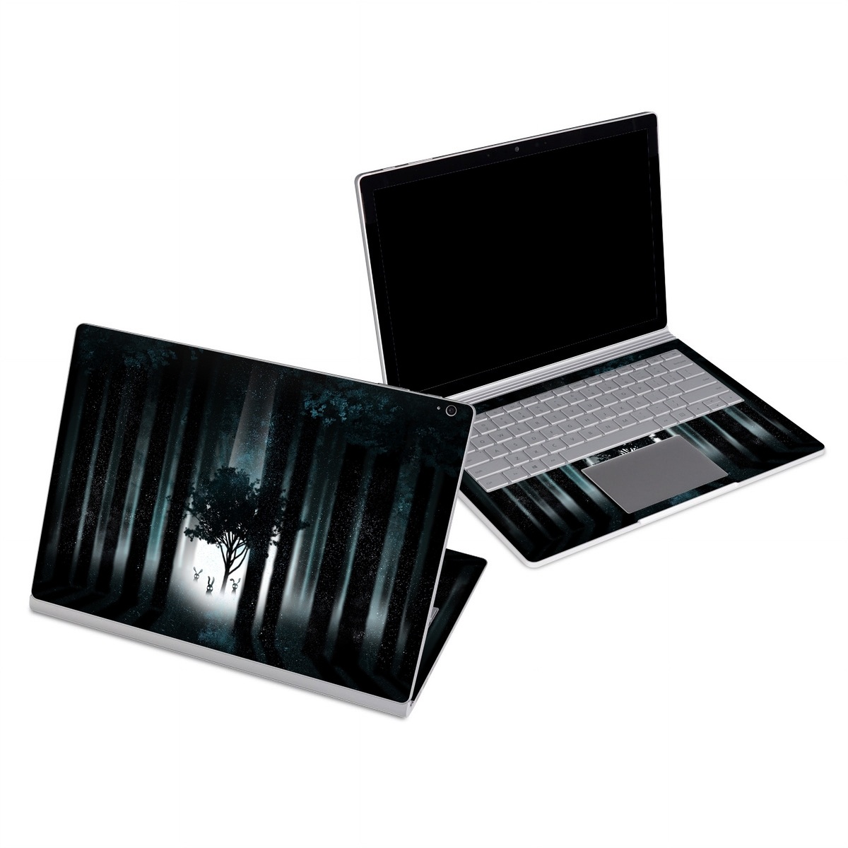 iStyles Microsoft Surface Book Series Skin design of Darkness, Black, Nature, Tree, Natural environment, Forest, Atmosphere, Atmospheric phenomenon, Light, Natural landscape, with black, blue, white colors, and tagged with animals, nature, fantasy, space, aliens, creatures, fae, fairy, forest, ghosts, lights, monsters, rabbit, scary, trees, ufo.