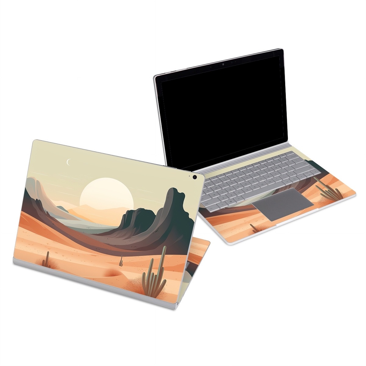 iStyles Microsoft Surface Book Series Skin design of Sky, Light, Nature, Natural landscape, Art, Landscape, Moon, Mountainous landforms, Formation, Erg, with orange, yellow, brown, green, white, black colors, and tagged with nature, desert, landscape, cactus, cliffs, sunset, moon, sand.