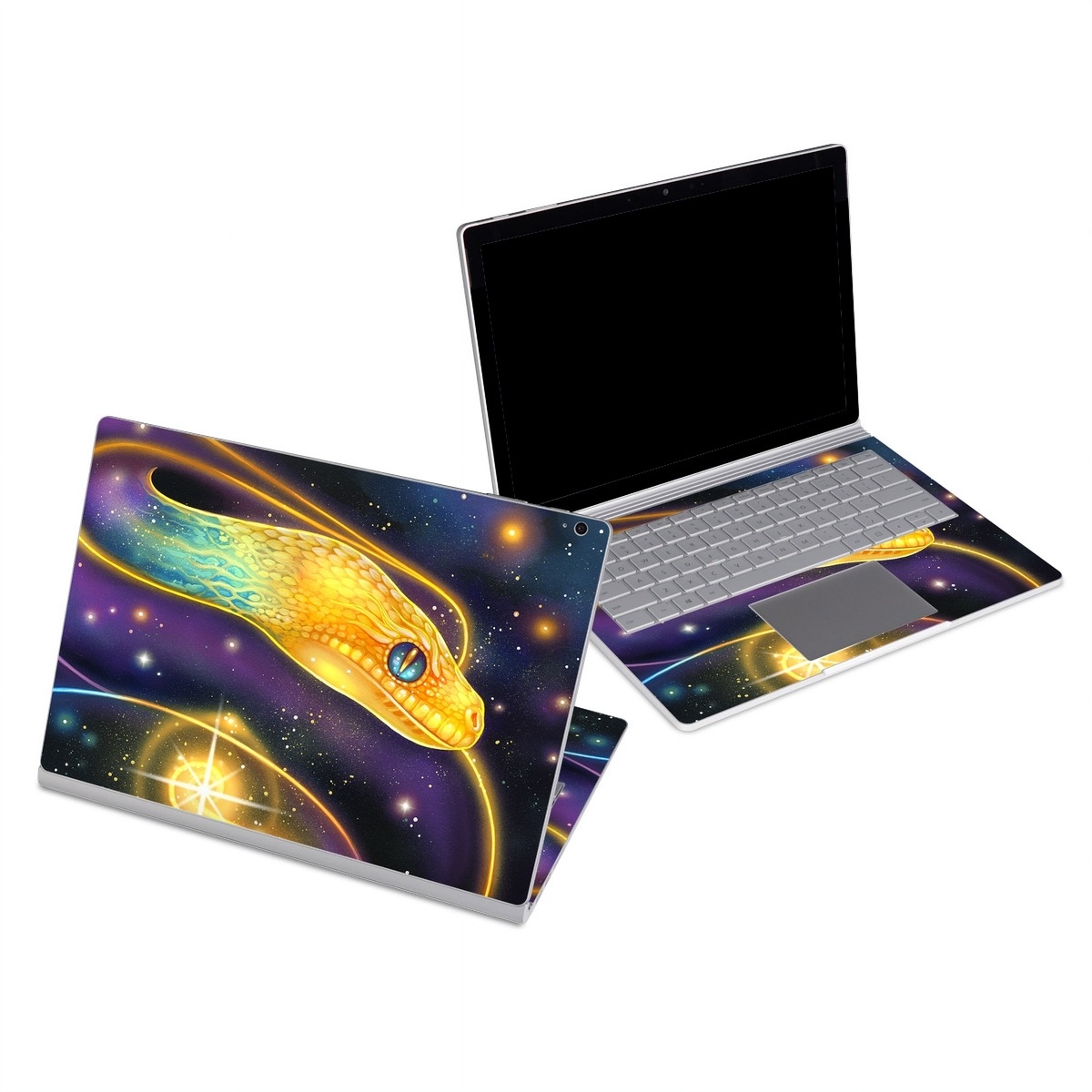 iStyles Microsoft Surface Book Series Skin design of Atmosphere, Light, Organism, Art, Font, Astronomical object, Galaxy, Star, Science, Nebula, with black, white, yellow, orange, green, purple colors, and tagged with fantasy, animals, space, snake, stars, constellations, sun.