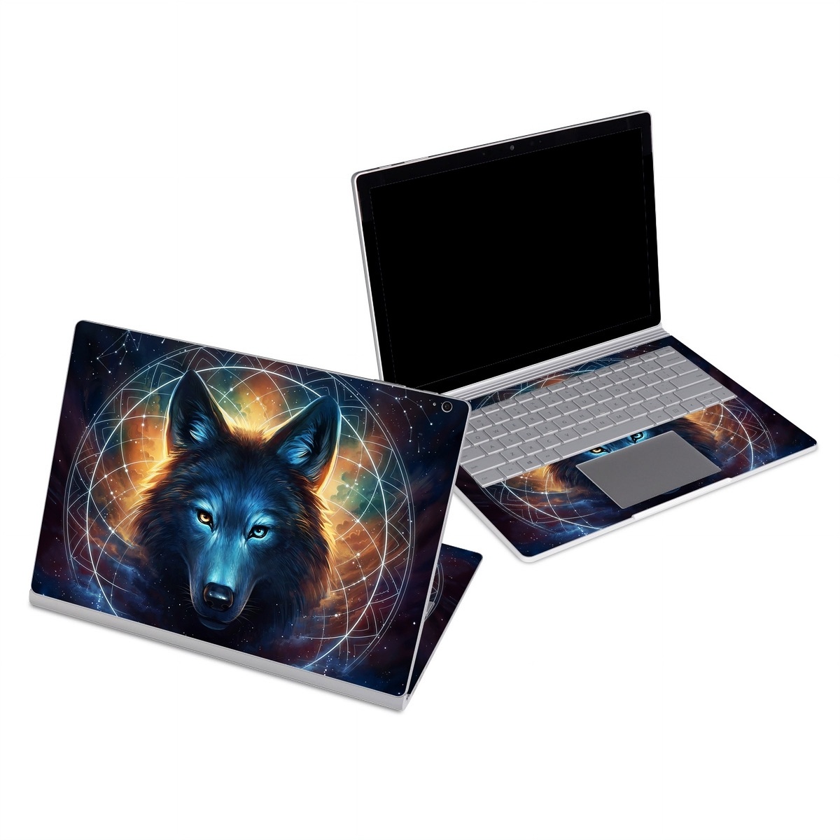 iStyles Microsoft Surface Book Series Skin design of Light, Nature, Carnivore, Organism, Dog breed, Art, Electric blue, Space, Midnight, Illustration, with black, blue, yellow, orange, green, red, white colors, and tagged with animals, signs, space, fantasy, blue, feathers, moon, sky, wolf, yellow.