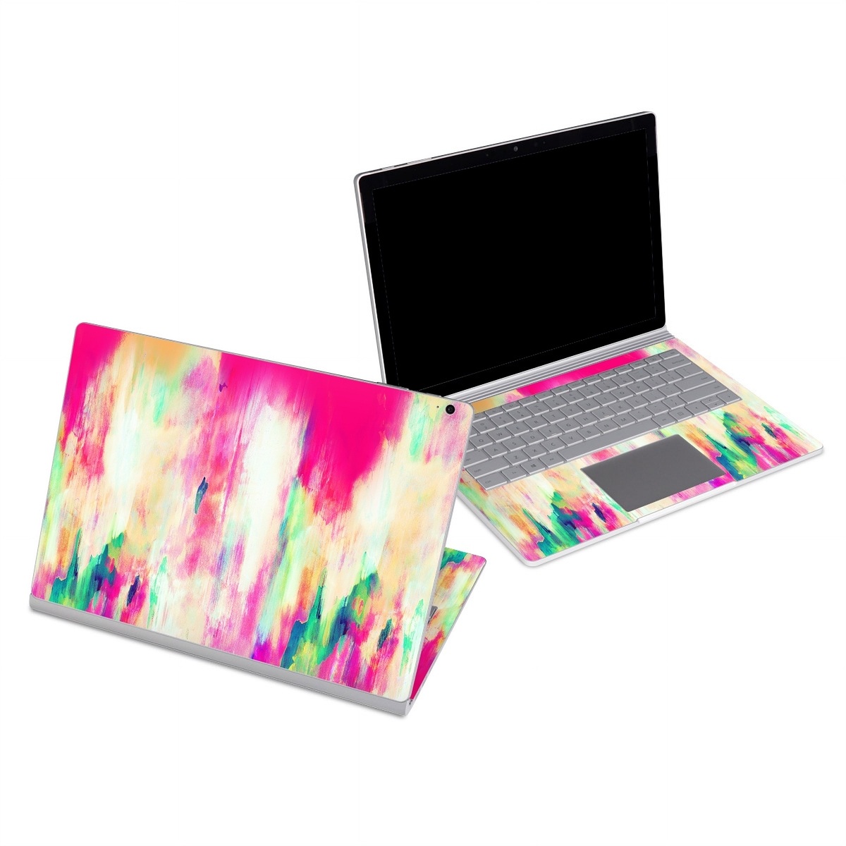 iStyles Microsoft Surface Book Series Skin design of Pink, Magenta, Art, Watercolor paint, Dye, Visual arts, Pattern, Modern art, Painting, Acrylic paint, with red, white, green colors, and tagged with abstract, patterns.