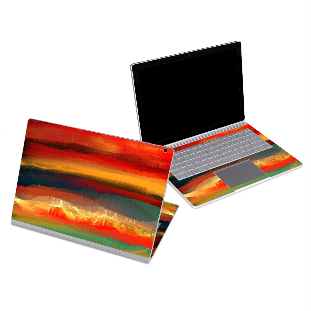iStyles Microsoft Surface Book Series Skin design of Sky, Red, Horizon, Afterglow, Orange, Painting, Acrylic paint, Watercolor paint, Sunset, Geological phenomenon, with red, blue, green, yellow, orange, white colors, and tagged with patterns, abstract, abstract, bright, layers, marble, painting.