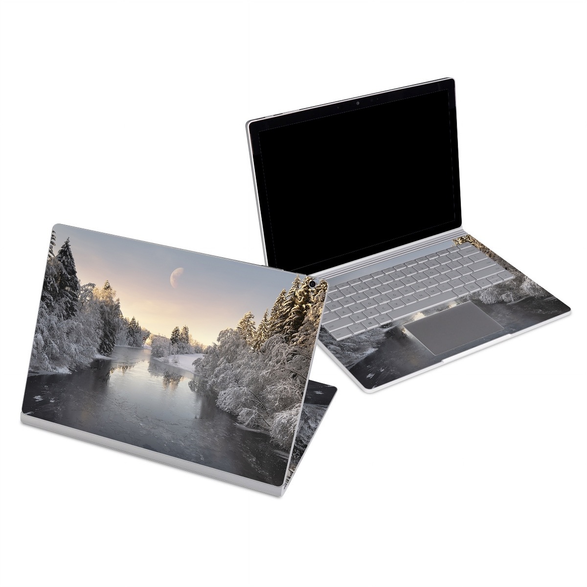 iStyles Microsoft Surface Book Series Skin design of Water, Cloud, Sky, Atmosphere, Water resources, Tree, Natural landscape, Moon, Snow, Dusk, with blue, black, yellow, orange, white colors, and tagged with nature, photos, day, ice, landscape, moon, nature, night, outdoors, photography, snow, trees, winter.