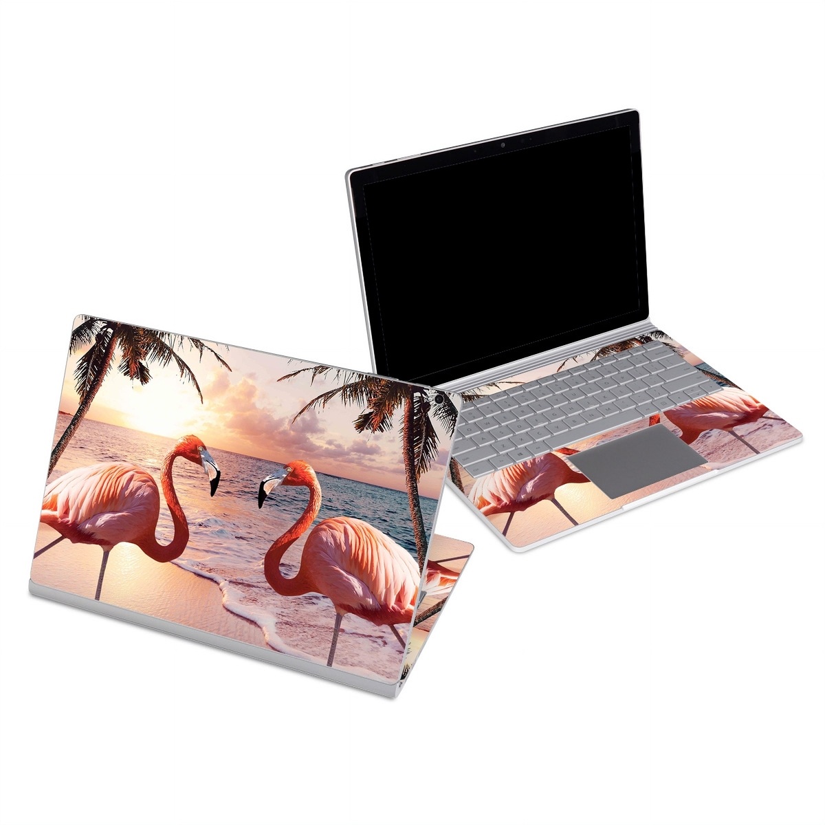 iStyles Microsoft Surface Book Series Skin design of Flamingo, Greater flamingo, Bird, Water bird, Pink, Wildlife, Sky, Tree, Organism, Beak, with pink, blue, green, yellow, white, orange, black colors, and tagged with animals, nature, animal, animals, beach, bird, birds, flamingo, ocean, palm, palmtrees, pink, sunset, tropical, tropics.